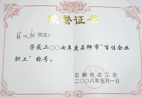薛漢安同志榮獲2007年度石獅市“百佳企業職工”稱號